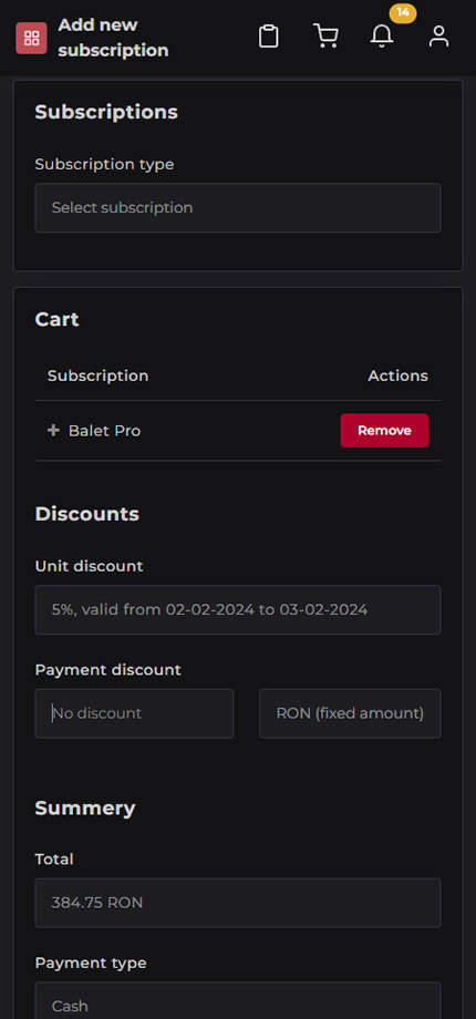 Fiecare scoala are unicitatea sa, iar platforma noastra permite personalizarea abonamentelor in functie de nevoile specifice. Administratorii pot emite noi abonamente, efectua check-in-uri rapide si accesa rapoarte financiare detaliate, toate intr-un singur loc.